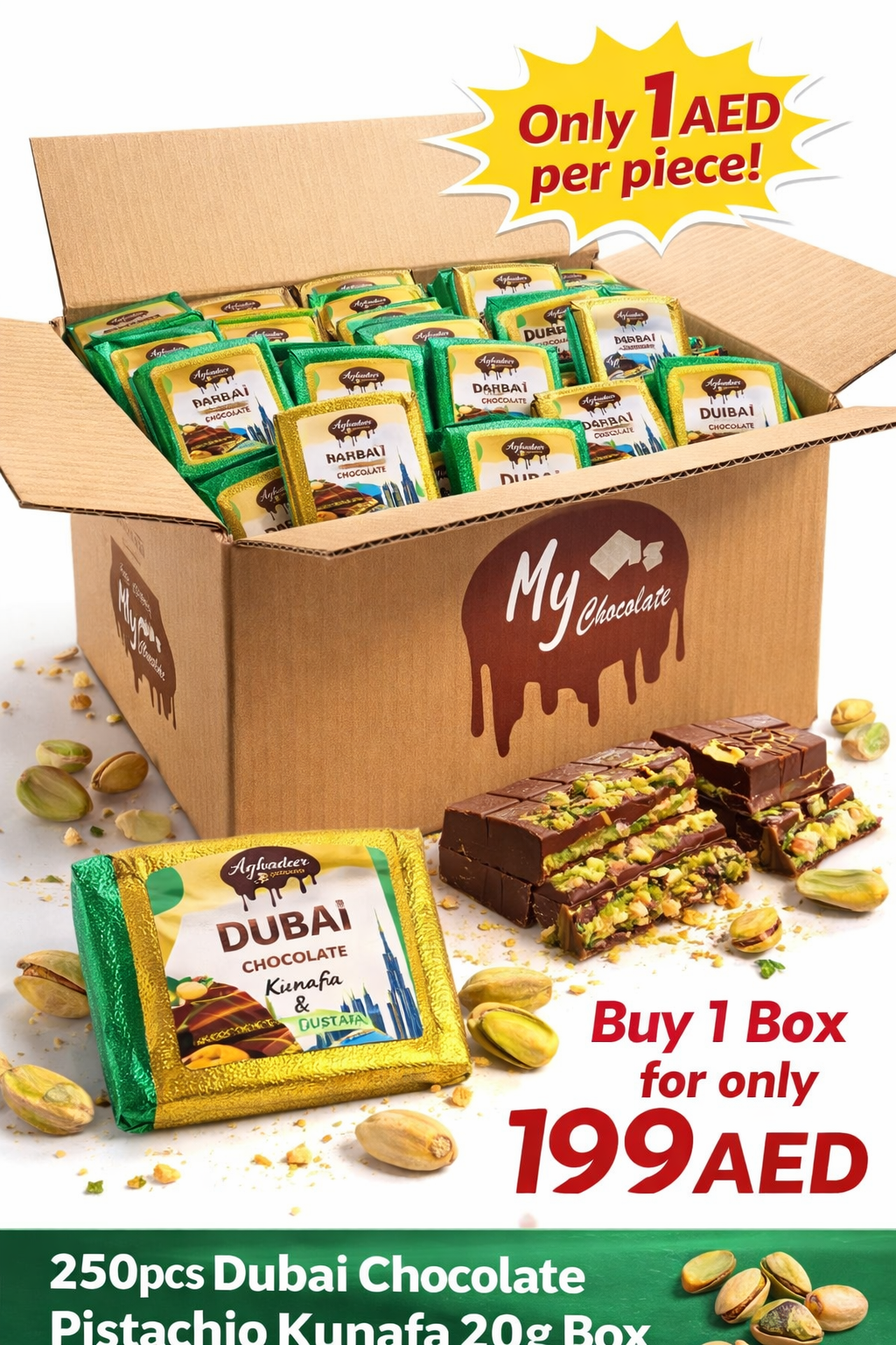 Indulge in the rich and luxurious taste of Dubai Chocolate Pistachio Kunafa 20g — a premium bite-sized treat inspired by the famous flavors of Dubai. Each piece is crafted with smooth creamy chocolate, crispy golden kunafa, and rich pistachio filling, creating a perfect balance of sweetness, crunch, and nutty goodness in every bite.
